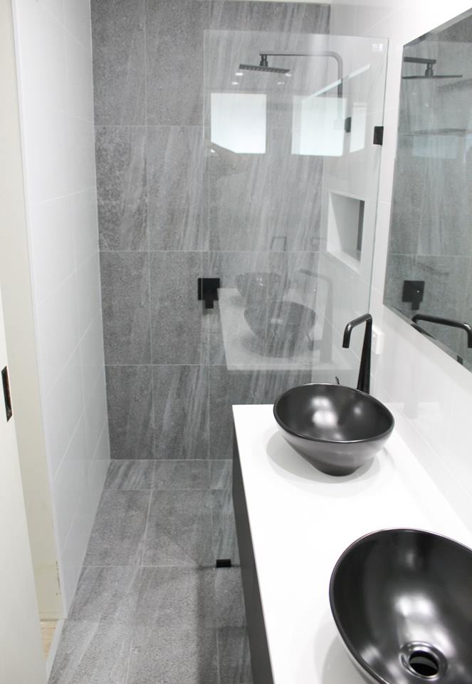 Using charcoal 300 x 600 rectified tiles this darker contrast keeps in the theme of the classic stone look.